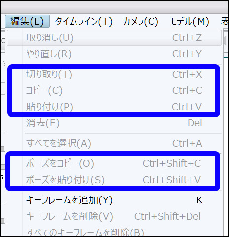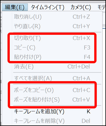 1.0.1以前は、「ポーズをコピー」「ポーズをペースト」にCtrl+c,Ctrl+vが割り当てられています。