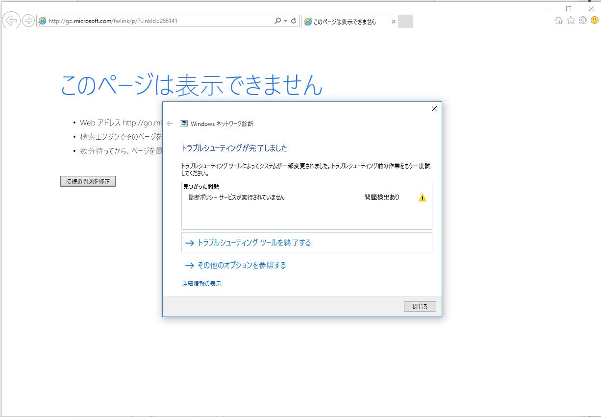 “接続の問題を修正”ボタンを押すと下記のメッセージが出たので