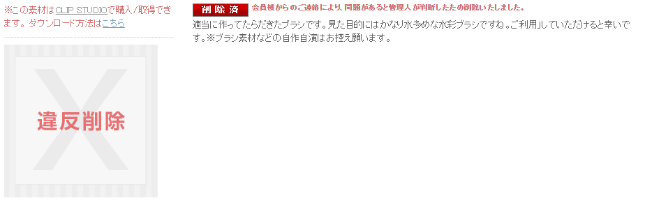 先日CLIP STUDIOで素材を作り、公開したのですが画像のように違反削除を受けました。自分が制作して公開した素材の人気度やDL数の状況を把握するために調べたときにこれが発覚しました。3つほどブラシの素材を公開したのですがすべて違反削除されていました。削除理由などが気になったのですが案の定のっておらず、私がどの違反を犯してしまったのか、今後同じ違反や過ちを繰り返さないようにも、どの違反を犯してしまったのか教えていただきたいです。 それともう一つ要望があるのですが自分の公開した素材が違反削除などがあった場合、CILPのあなたへのお知らせで違反対象とともにお知らせを送ってきてもらえるようにはできないでしょうか?わがままは承知の上なのですがどうかご検討ください。 削除されたブラシ素材 ・タイトル:自作水彩?薄い コンテンツID:1637618 ・タイトル:自作水彩?濃い目 コンテンツID:1637610 ・タイトル:ぐしゃあリアル筆(薄) コンテンツID:1637794 ![]() ------------------------------------------------------------ ■バージョン: ※[ヘルプ]メニュー → [バージョン情報]で確認できます。 ■グレード DEBUT( ) comico( ) PRO( 〇 ) EX( ) ■OS Windows XP( ) Windows Vista( ) Windows 7 ( ) Windows 8( ) Windows 8.1( 〇 ) Windows 10( ) MacOS X 10.5( ) MacOS X 10.6( ) MacOS X 10.7( ) MacOS X 10.8( ) MacOS X 10.9( ) MacOS X 10.10( ) MacOS X 10.11( ) その他( ) ------------------------------------------------------------ |
