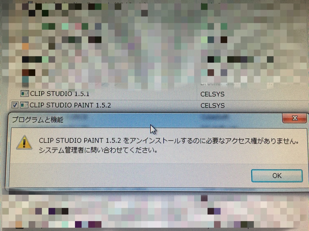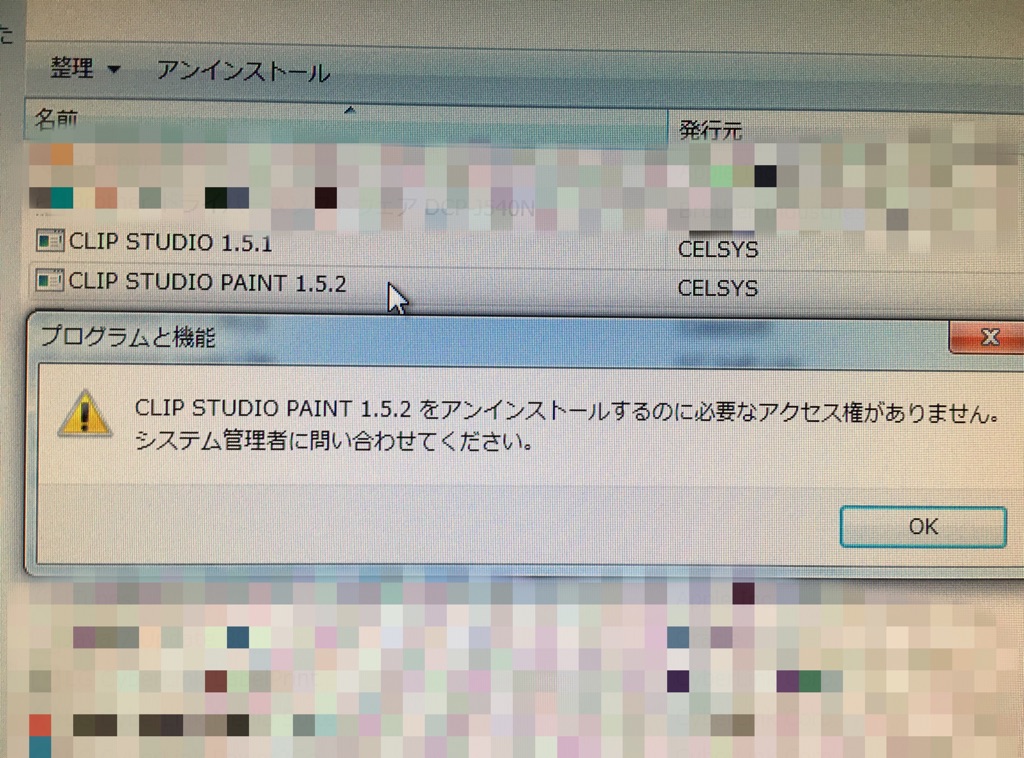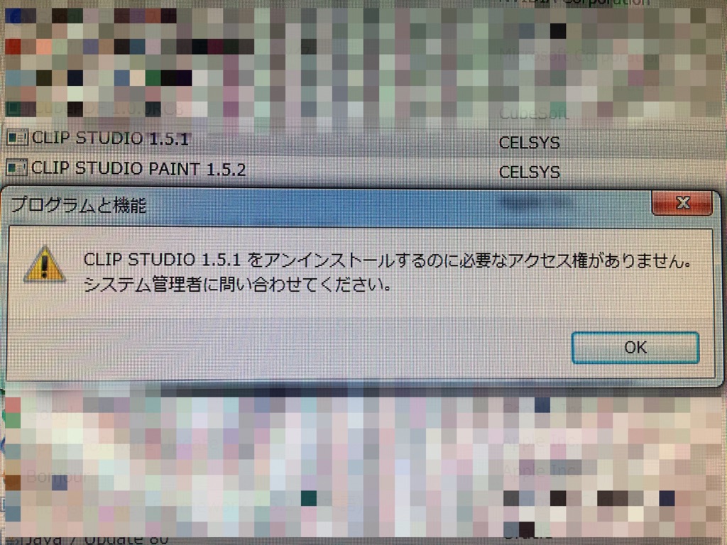 ①CLIP STUDIO購入の検討に際し、体験版を試用。試用後にコントロールパネルよりアンインストールを行おうとしたところ以下のメッセージが表示されアンインストールが実施できなかった。![]() ②本日CLIP STUDIO製品版を購入したので再度アンインストールを試みたが相変わらずであった為、Program Files内のデータ(「CELSYS」フォルダ)を直接削除。 ③コントロールパネルからは上述のCLIP STUDIOファイルは削除されず(相変わらずアンインストールできず)、インストールに支障がないか体験版をインストールすることで予め確認したところ、以下のメッセージが表示されインストールも実施できなくなった(「管理者として実行」も実施するも変わらず)。 ![]() ①についてはPC再起動→アンインストールを日を開けて何回か実行しても状況変わらず、又、③についても何回か体験版ファイルを何回かダウンロードし直し、ファイルに問題はないものと推測(PC再起動も実施)。 ②の対応が問題であったと承知しておりますが、旧ファイルの削除、及びファイルのインストール方法について対応方法をご教示下さい。 ------------------------------------------------------------ ■バージョン: ※右上の[?]アイコンをクリック後に[バージョン情報]で確認できます。 ■OS Windows XP( ) Windows Vista( ) Windows 7 (○) Windows 8( ) Windows 8.1( ) Windows 10( ) MacOS X 10.5( ) MacOS X 10.6( ) MacOS X 10.7( ) MacOS X 10.8( ) MacOS X 10.9( ) MacOS X 10.10( ) MacOS X 10.11( ) その他( ) ------------------------------------------------------------ |