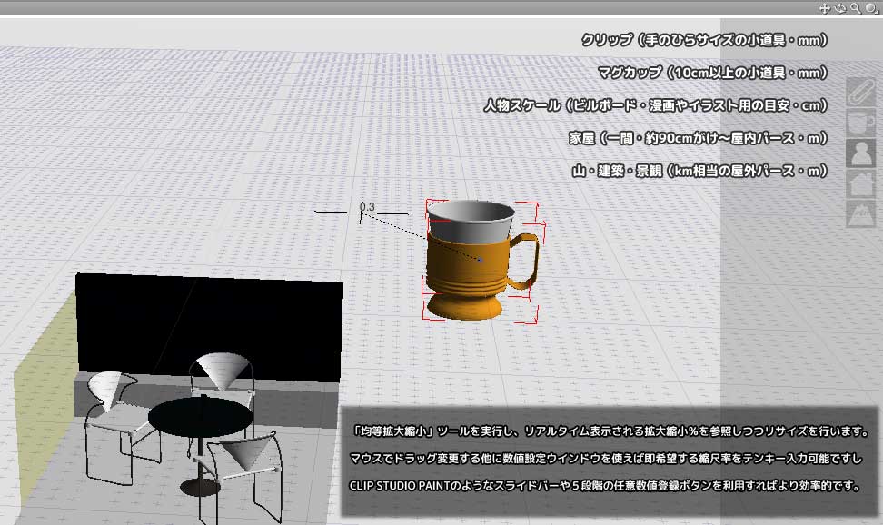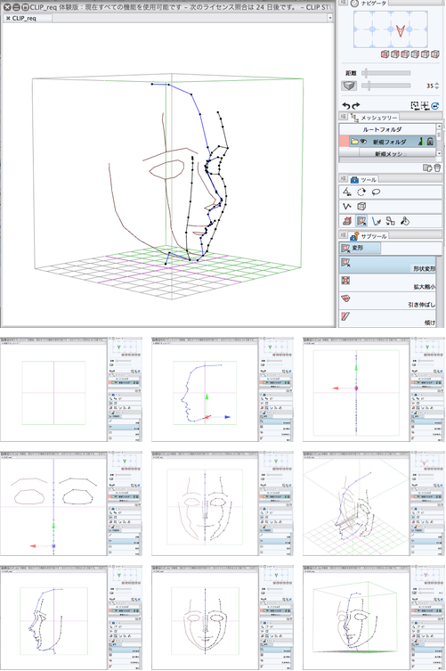 お疲れさまです。 お言葉に甘えて今の段階で気付いたこと、要望を二三投稿します。 3Dモデラーの操作やUI設計への対応についてはユーザーそれぞれ異なる印象もあると思います。 またMacOSX・Rosettaサポート打ち切りをきっかけにWindows版Super6を導入するまで長い間Mac版Super4を使ってきたため、六角大王Super4止まりの情報がまじるかもしれません。ご容赦下さい。 ■「新規書類作成...」に通常その他モード(現在はありませんが対称・3Dマンガモードなど)テンプレートの選択肢は必要です。 ■下絵・三面図の貼り付け、モデリング画面の背景色や各種ツールの表示色カスタマイズ機能は必要です。 ■「対称モード」または「対称モードに設定したレイヤー」の実像・虚像を左右交互に切り替えるショートカット(六角では「/」)はあらゆる角度からモデルを調整する際必要です。 ■点・線・面の変更・移動時に表示されていたマニピュレーター座標ガイドの復活予定はありますか? ![]() ■角度調整(MODELERではナビゲーター)の上下方向が逆になっている、反転オプションの追加予定はありますか? 参考:Free版六角大王〜Super6(画像はCLIPオンラインマニュアルのもの)までの角度設定(ナビゲーター)概念 ![]() ![]() ![]() ![]() ![]() ![]() ![]() ■CLIP STUDIOファミリー全体に共通することですが各種パレットサイズをスリム化できませんか? 画像はSuper4ではなく同6のものですがモデリング・仕上げ表示(アニメ調)用ツールをならべると今後追加されるであろう各種機能ごとにパレットが増えればモデリング画面スペース確保を確保するだけでも大変です。 ツールUI設計に改善の必要性を痛感します。 ![]() ![]() ■ツールパレット1つに整理出来るものはSuper6までの良さを踏襲して戴けないでしょうか? (画像はSuper4のHTMLマニュアルのツールパレット解説です) ![]() 行数・画像がおおくなってしまったことをおわびします。 よろしくお願いいたします。 ------------------------------------------------------------ ■バージョン:0.9.0 ※[ヘルプ]メニュー→[バージョン情報]で確認できます。 ■OS Windows XP( ) Windows Vista( ) Windows 7 ( ○ ) Windows 8( ) MacOS X 10.6( ) MacOS X 10.7( ) MacOS X 10.8( ○ ) その他( ) ------------------------------------------------------------ |