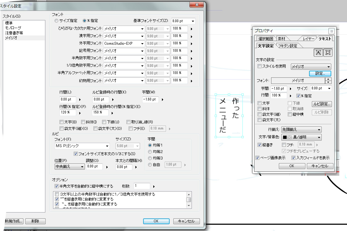 また、ComicStudio付属のフォントには、理想的なフォントがありませんでしたのでメイリオを使用しています。