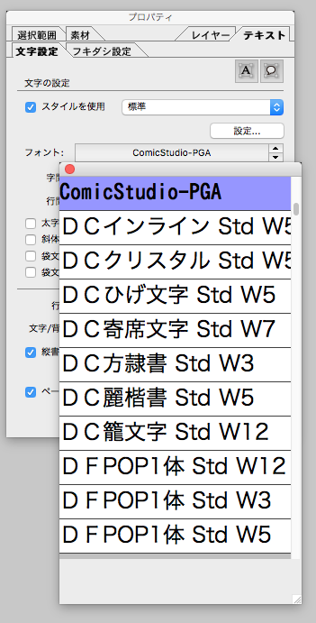 未だクリスタへの移行を渋っており、 そんな折に調子が悪くなってしまい困り果てております。 手持ちのフォントの中に、DC○○というものやDF○○というものがあります。 それらが突然使用できなくなりました。 考えられるのは、最近Elcapitanをインストールしたことなのですが、他に思い当たりません。 加えて、テキストパネルを開くと急にグッと動作が重くなり、虹色のカーソルがクルクルクルクル…3分くらいかかります。これでは文字を全く打てません。そのままフリーズしてしまう事も多々有ります。 セーフブートでの起動もしてみましたが改善しませんでした。 よく使用するフォントで30種類以上は入っているので非常に困っております。 ちなみに、他のソフト、クリスタやフォトショでは問題なく使用できました。 画像を添付しておきます。通常、こちらのテキスト一覧はフォントが適用されなければなりませんが、このDC、DFフォントは均一のMSゴシックのようなもので表示されてしまっており、選択して打とうとするとコミスタがフリーズしてしまい使えません。(comicatudio-PGAはきちんと表示されており、使えます。) ![]() どうしたらよいでしょうか? 再インストールも考えましたが、ディスクを紛失してしまっており今すぐには難しい状況です。 助けてください… 【使用環境】 iMac (27-inch, Late 2013) プロセッサ 3.2 GHz Intel Core i5 メモリ 24 GB 1600 MHz DDR3 ペンタブレット wacom intuos5 ------------------------------------------------------------ ■ComicStudio ComicStudioEX( ) ComicStudioPro( ○ ) ComicStudioMini( ) ComicStudioDebut( ) バージョン: ※Windowsは、[ヘルプ]メニュー → [バージョン情報]で確認できます。 ※MacOSXは、[ComicStudio(各グレード)]メニュー → [バージョン情報]で確認できます。 ■OS Windows XP( ) Windows Vista( ) Windows 7 ( ) Windows 8( ) Windows 8.1( ) Windows 10( ) MacOS X 10.5( ) MacOS X 10.6( ) MacOS X 10.7( ) MacOS X 10.8( ) MacOS X 10.9( ) MacOS X 10.10( ) MacOS X 10.11( ○ ) その他( ) ------------------------------------------------------------ |