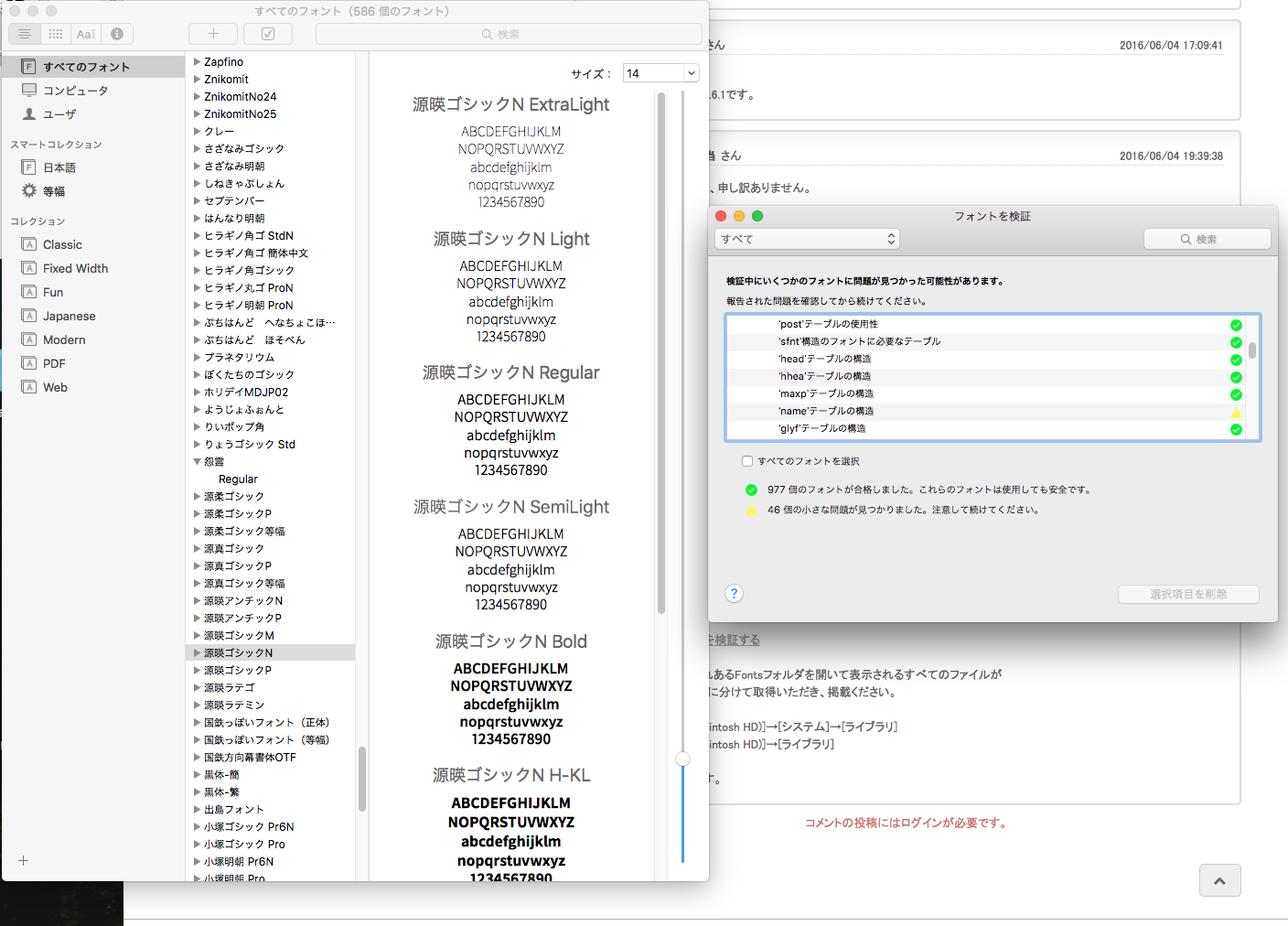 恐れ入りますが、Font Bookで検証をおこなった際にて検出される問題の