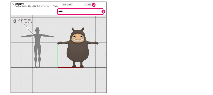①スライダーをドラッグします。ガイドモデルの腕の角度が変わります。左右の3Dモデルの腕の角度が同じになるまで調整します。