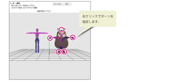 3Dモデルのボーンに対して、標準ボーンを割り当てます。画面の指示に従って、3Dモデルのボーンを右クリックしていきます。