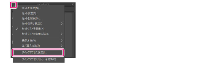 初期設定の[クイックアクセス]パレットでは、メニュー表示のほか、ボタンリストの[クイックアクセス設定]をクリックしても、[クイックアクセス設定]ダイアログを表示できます。 |