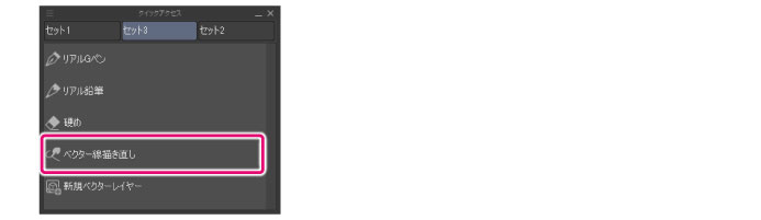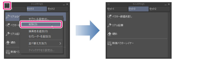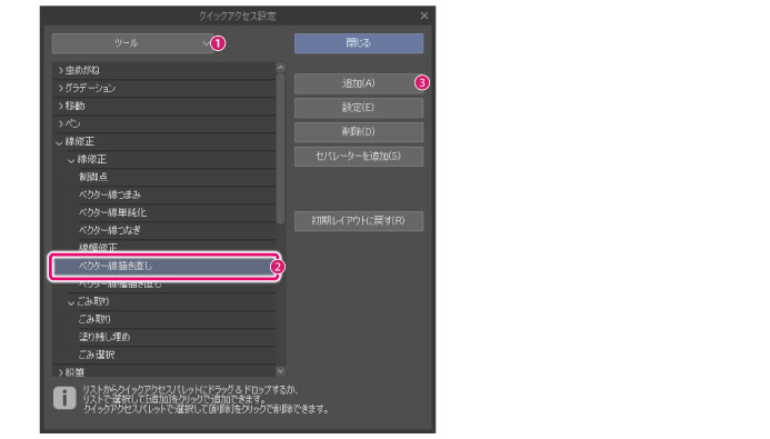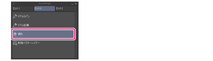 ·Windows/macOS/タブレットをお使いの場合は、[クイックアクセス設定]ダイアログから追加したい機能を選択し、[クイックアクセス]パレットにドラッグ&ドロップしても、ボタンを追加できます。 ·ボタンリスト上で右クリックして表示されるメニューから、[描画色を追加]を選択すると、[クイックアクセス]パレットに選択中の描画色が追加されます。 |