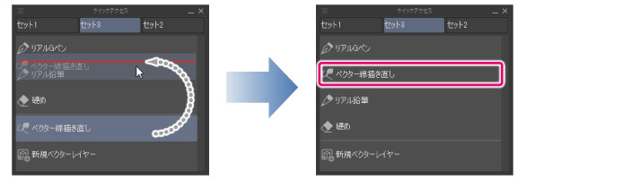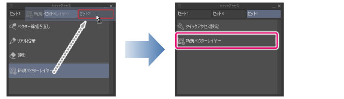 ボタンリストのボタンを、移動したいクイックアクセスセットに[Ctrl]キーを押しながらドラッグ&ドロップします。