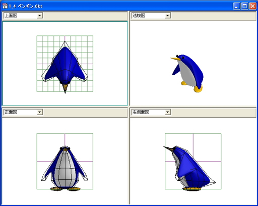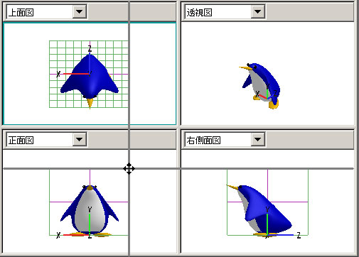 現在アクティブになっているドキュメントウィンドウを4面図にします。表示が遅くなるなどの問題があるので、初心者の方がこのモードで操作することはおすすめしませんが、精密な形を作りたいときなどに利用すると便利です。