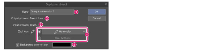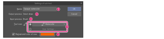 ·For details on [Output process] and [Input process], see "Input Process and Output Process of Sub Tools". ·Acceptable file formats for [Tool icon] → [User settings] are: BMP, JPEG, PNG, TIFF and Targa. ·For details on the [Color settings] dialog box, see "Advanced settings of color Dialog Box". |