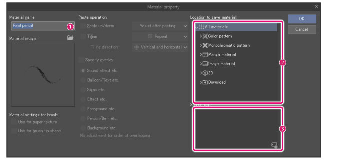 ·A sub tool can also be registered as material by dragging and dropping the selected sub tool to a [Material list] on the [Material] palette. When registered in this way, the [Material property] dialog box does not display. ·Sub tools registered to the [Material] palette can be uploaded to the CLIP server using the included portal application, CLIP STUDIO. For details on uploading methods, please see Clip Studio TIPS. ·Clip Studio can be started from the [File] menu ([CLIP STUDIO PAINT] menu on macOS and Tablet) > [Open CLIP STUDIO]. For the Smartphone, select [Menu] > [Usage / Material / Work / Support]. |