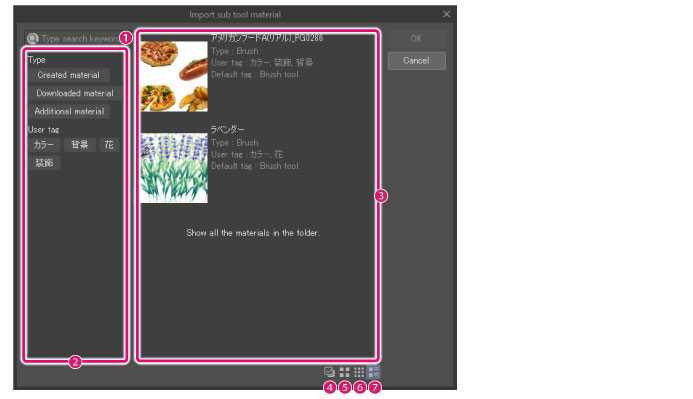 Display sub tool materials downloaded from CLIP STUDIO ASSETS in a list.