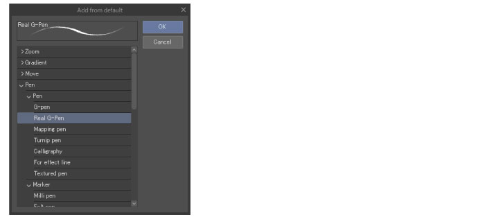 Select a sub-tool to from [Add from default] dialog box and select [OK] to add the selected tool to the [Sub Tool] palette.