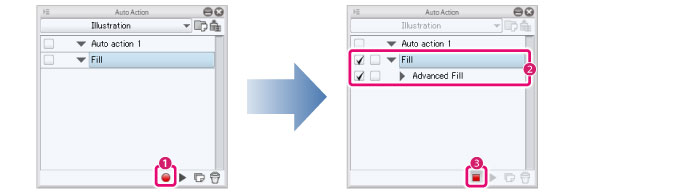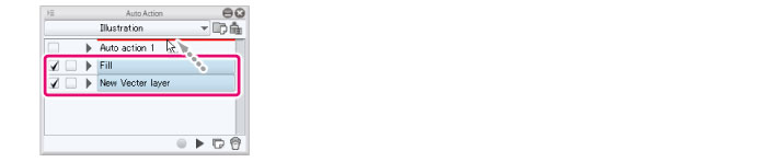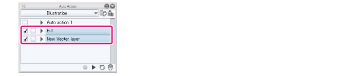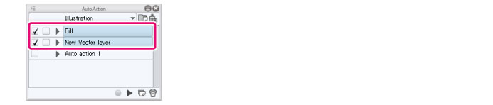 ·For tool and sub tool operations, only the movement of layers and selections can be recorded. No other operations can be recorded. Furthermore, there may be palette and menu operations that cannot be recorded. ·Clicking [Start to record auto action] again allows you to add new commands after the currently selected command. |