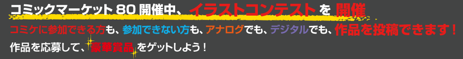 | コンテスト概要 | コミックマーケット80会場で配られる本コンテスト向け「うちわ」または、CLIPで公開される「うちわテンプレート」を使って、お題にあったイラストを投稿し、投稿作品が優秀作品に選ばれると豪華賞品をゲットできます。 |