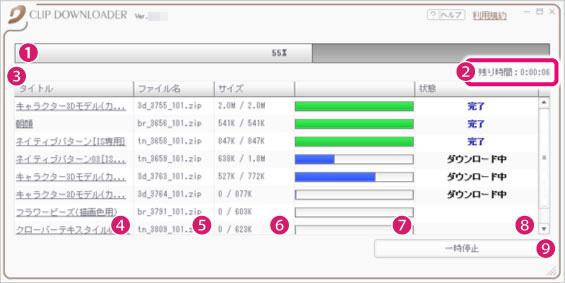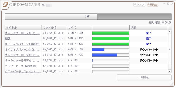 | 一時停止 | : | クリックするとダウンロードを中断します。 |