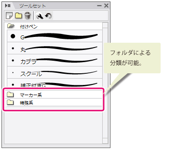 ツールセットをフォルダで分類できるようになり、ブラシの管理がしやすくなりました。