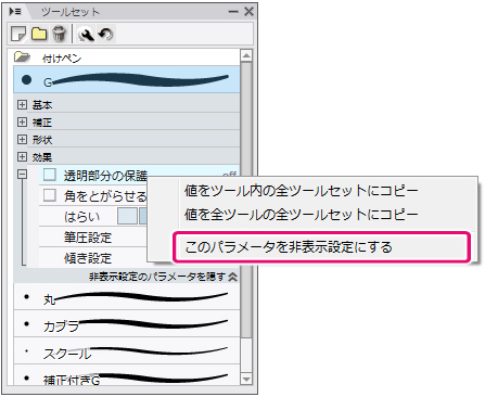使用頻度の低いパラメータを非表示設定にすることで、すっきり見やすいパレットレイアウトにカスタマイズできます。
