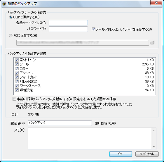 環境設定や素材等のデータを、バックアップ用としてお使いのコンピュータのフォルダに書き出しできるようになりました。