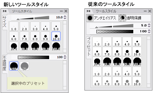 従来はブラシサイズと不透明度が連動して[プリセット]リブに登録されていましたが、それぞれ[サイズ]、[不透明度]リブに別れ、個別に設定できるようになりました。