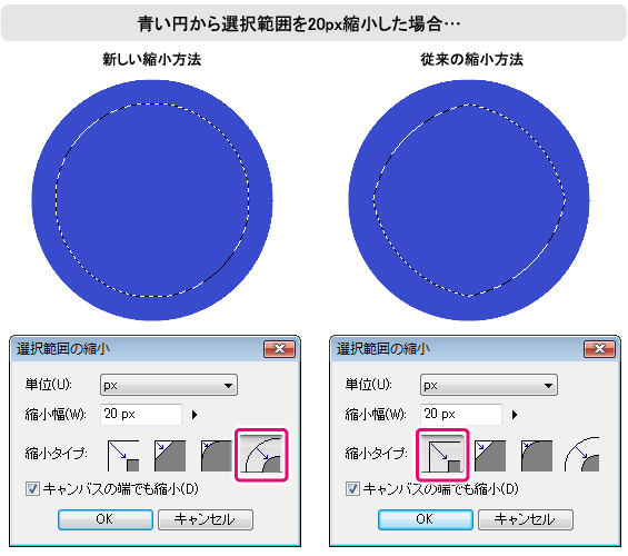 [選択範囲の縮小]ダイアログの[縮小タイプ]に、選択範囲の端から等距離に縮小するタイプが追加されます。円形の選択範囲もきれいに縮小できます。