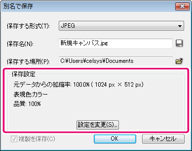 汎用画像形式でのファイルの保存時に、[元データからの拡縮率]や、[表現色]など、保存設定の情報が表示されるようになります。書き出しの際に設定画面を表示しなくても、設定を確認できます。