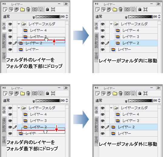 従来は、レイヤーフォルダ内で一番下に位置しているレイヤーと、レイヤーフォルダの一つ下にあるレイヤー(下図で「レイヤー2」の位置にあるレイヤー)を任意の位置に移動できないことがありましたが、これが改善されます。