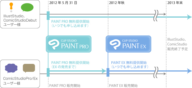 また、ComicStudio、IllustStudioは、今後リリースが予想される新しいOSへの対応など、これからもしっかりアップデート・サポートをいたしますので、ユーザー様は、引き続きComicStudio、IllustStudioを活用いただけます。無償利用できるCLIP STUDIO PAINT PRO をお試し頂きながら、十分な期間をもって移行をご検討ください。