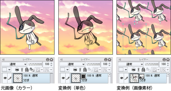 - [レイヤー]パレットで選択したレイヤーの種類を変換できます。レイヤーの表現色・種類を変更したり、選択範囲の描画を画像素材レイヤーに変換したりできるようになりました。