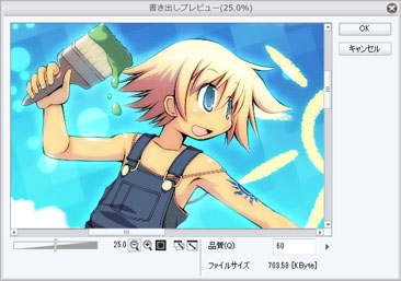 - 指定の形式で保存するときに、[書き出しプレビュー]ダイアログが表示されるようになりました。また、JPEG形式で書き出す場合は、プレビュー画面を確認しながら、圧縮品質を調整できます。