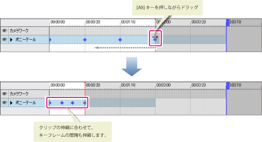 [Alt]キーを押しながら最終フレームをドラッグするだけで、簡単にクリップの再生速度を調整できます。