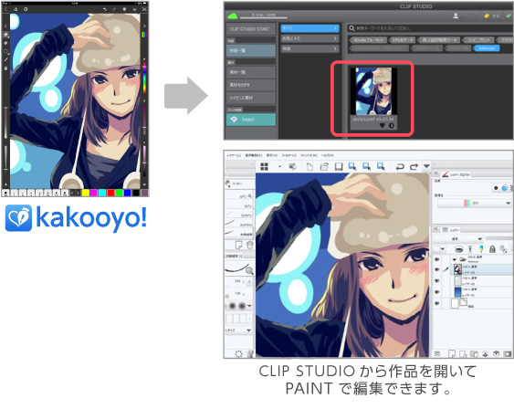 kakooyo!で描いた作品をレイヤーの構成と透明度、合成モードなどのレイヤーの設定情報を維持したまま、 CLIP STUDIOのクラウドにアップロードし、CLIP STUDIO PAINTで編集できるようになりました。