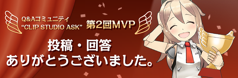 CLIP STUDIO ASKの第2回(2017年第4四半期)のMVPが決まりました。 CLIP STUDIO ASK MVPは、継続的に役立つ回答を投稿いただいた皆さまを感謝の気持ちをこめて表彰させていただくものです。