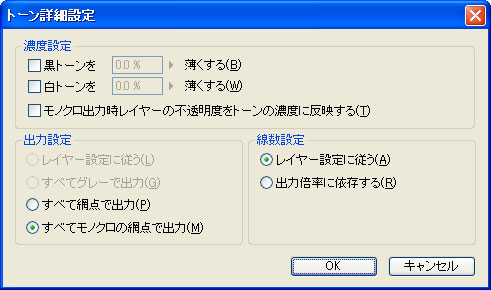 [トーン詳細設定]ダイアログが表示されます。プリント時のトーンの濃度や、トーンの出力方法などを設定できます。詳しくは、『ComicStudio4.0ユーザーガイド』→第2章『ファイル』を参照してください。