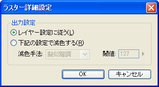 [ラスター詳細設定]ダイアログが表示されます。ラスターレイヤーの出力方法を設定できます。詳しくは、『ComicStudio4.0ユーザーガイド』→第2章『ファイル』を参照してください。