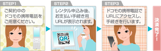 レンタル手続き完了後、ドコモ ケータイ払いのお手続き画面のQRコード®が表示されますので、携帯電話でアクセスし、手続きを進めてください。