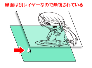つまり、線画と違うレイヤーに塗りつぶしを行う場合、線画は無視されてしまいます。