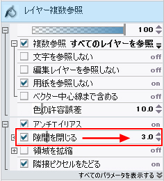 [隙間を閉じる]のチェックをオンにすると、指定した幅よりも狭い隙間があっても、そこで塗り止まるようになります。