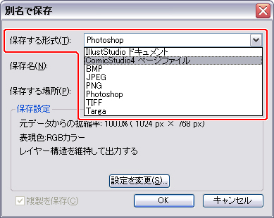それぞれの形式の詳細な設定についてはイラストスタジオ マニュアルの「IllustStudioユーザーガイド」→「メニュー」→「ファイルメニュー」→「保存」を参照してください。