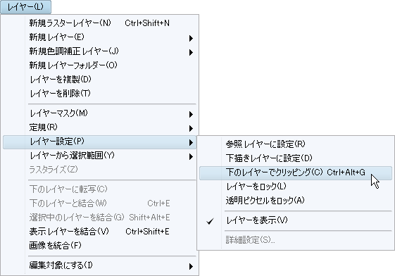 6.影付けを行ったレイヤーを選択した状態で、[レイヤー]メニュー→[レイヤー設定]→[下のレイヤーでクリッピング]を選択します。
