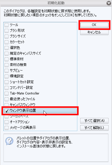 再度、ダイアログを表示するには、以下の操作にて[ウィンドウ表示位置]の初期化