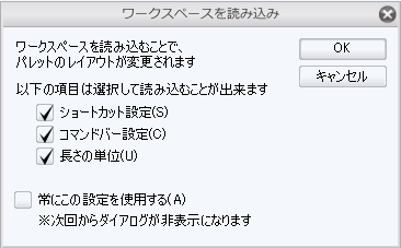 「ワークスペースを読み込み」ダイアログは、[常にこの設定を使用する]のチェックを