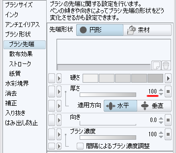3. モノクロレイヤーへの描画、またはアンチエイリアスがオフの状態で、[厚さ]の値が