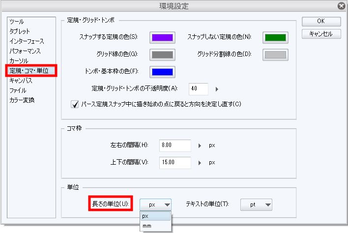 「定規・コマ・単位」内の[長さの単位]を[mm]にして描画をお試しください。