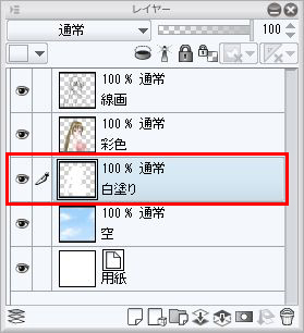 キャラクターの作画が終わり、背景に取り掛かろうとした際に、 下図のようにキャラの内部に描画が入ってしまう場合、キャラクターの 彩色が半透明、あるいは透明状態になっています。 ![]() レイヤーパレットで[用紙]レイヤーの目のマークをクリックして、 用紙を非表示にすると、透明箇所が格子模様で表示されるため、 どういった状態になっているか分かりやすいです。 用紙表示状態だと問題なく塗られているように見えても、水彩などで 塗った場合は薄く塗られるため実際はほとんどが透けている状態です。 ![]() ![]() そのため、この状態で背景を描画するには、キャラクターの線画の内側を白で塗りつぶした レイヤーを別途作って間に挟みます。 レイヤー構造としては下図のようになるため、彩色部分が透けない状態になります。 ![]() ![]() ![]() 白塗りのレイヤーを作る以外にも、マスクを作成したり、逆に背景を線画の 外側のみに描画するなど色々な方法がありますので、用途に応じて お試しください。 |
