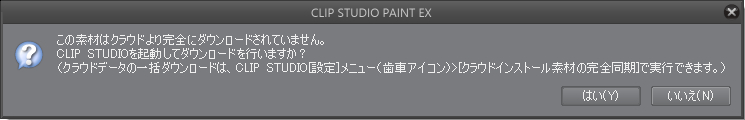 バージョン1.6.0以降、ソフトウェアに付属している素材はCLIP STUDIOから ダウンロードされるようになりました。 初回起動時には、素材一覧や素材パレットには素材のサムネイルのみ表示されており、 実データはまだダウンロードされていません。 実データの無いデータは以下のように雲のアイコンが付いています。 ![]() この素材をソフトウェア上で貼り付けると、ダウンロードを促すメッセージが出ますので、 [はい]を選択するとその素材がダウンロードされて使用できるようになります。 ![]() ただ、多くの素材を個別にダウンロードするのが大変な場合は、CLIP STUDIOの 右上の歯車のアイコンから、[クラウドインストール素材の完全同期]を選択することで 一括で素材データのダウンロードが出来ます。 ![]() ※大容量の通信が発生するため、通信環境によってはダウンロードに時間が かかることがあります。 |