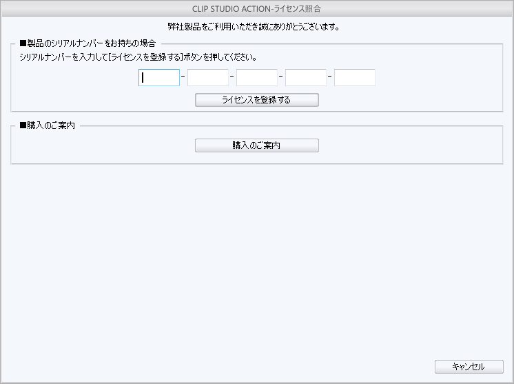 macOSは、[CLIP STUDIO ACTION]メニュー→[ライセンス登録]