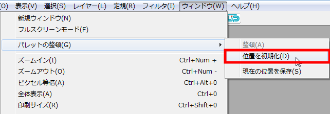 1.[ウィンドウ]メニュー→[パレットの整頓]→[位置を初期化]を選択します。2.パレットの表示位置が初期設定時に戻ります。