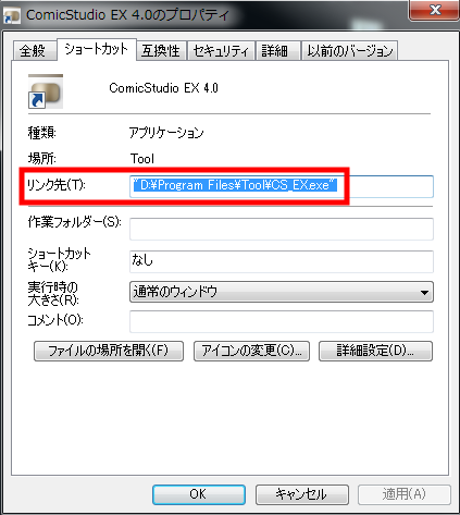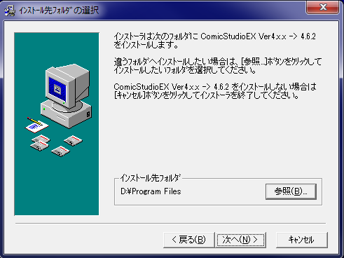 ※ComicStudio4.0 EXをDドライブの「Program Files」フォルダにインストールしている例です。
